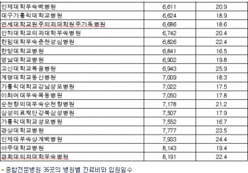 그러나 경희대의과대학부속병원은 819만1천원으로 가장 비싸 두 병원 간 차이가 무려 348만원에 이르고 있다.