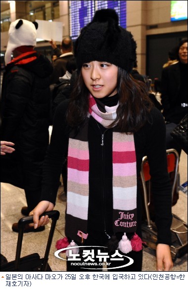 전주 4대륙 피겨선수권에 출전하는 아사다 마오(20 · 일본)가 25일 오후 6시경 나고야에서 출발하는 JL5219편을 통해 한국땅을 밟았다. 입국시간은 A게이트에서 아사다 마오가 모습을 드러내기까지 베일에 감춰져있었다.