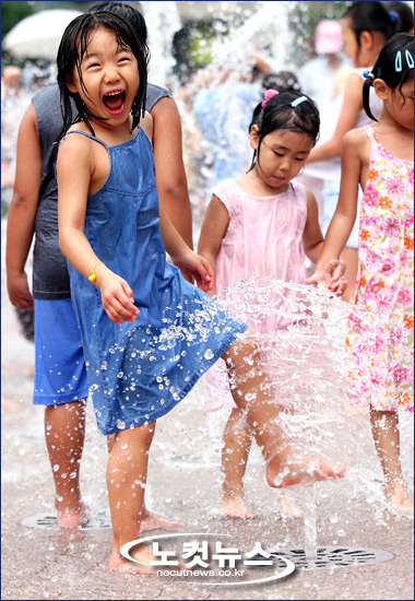 서울의 최고기온이 35도를 기록하는등 전국 대부분의 지방에 35도 안팎의 무더위가 이어진 6일 오후 서울 시청앞 광장의 분수대에 모여든 아이들이 시원한 물줄기를 벗 삼아 즐거운 한때를 보내고 있다.