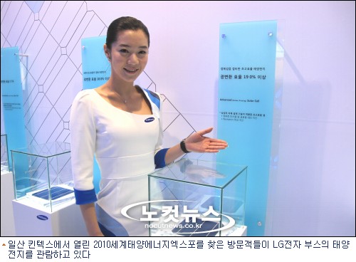 LG전자가 3일부터 5일까지 일산 킨텍스에서 열리는 ''2010 세계태양에너지엑스포''에 참가해 144평방미터 규모의 전시부스를 마련하고 지난해 말 양산을 시작한 태양전지 제품을 선보인다.