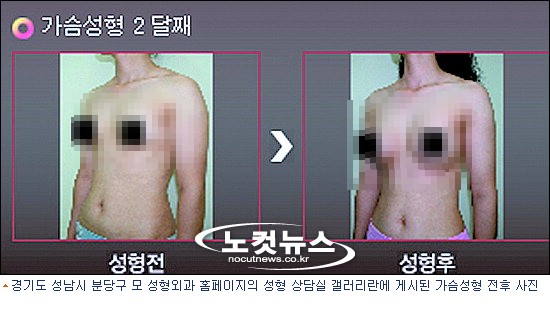 4일 본지 취재결과에 따르면, 경기도 성남시 분당구에 위치한 A 성형외과는 성형 상담실 갤러리란에 ''가슴성형 2달째''라는 설명 문구와 함께 두 장의 여성 가슴성형 전·후 사진을 홈페이지에 게시해 놓았다.