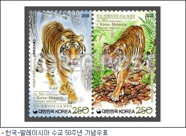 전국 우체국에서 23일부터 판매되는 이번 기념우표는 2종 75만장(총 150만 장)으로 전 세계적으로 멸종위기에 처해 있는 호랑이를 담았으며 우리나라는 한국호랑이를, 말레이시아는 말레이호랑이를 디자인했다.
