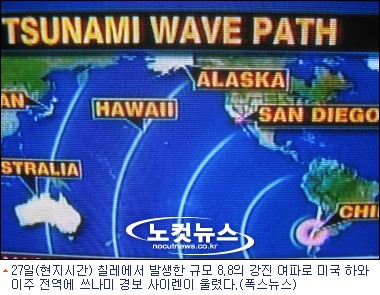 칠레 서부를 강타한 규모 8.8의 강진 여파로 태평양 연안 국가에 지진해일(쓰나미) 경보가 발령된 가운데 27일(현지시간) 새벽 6시를 기해 미국 하와이주에 쓰나미 경보 사이렌이 울렸다.