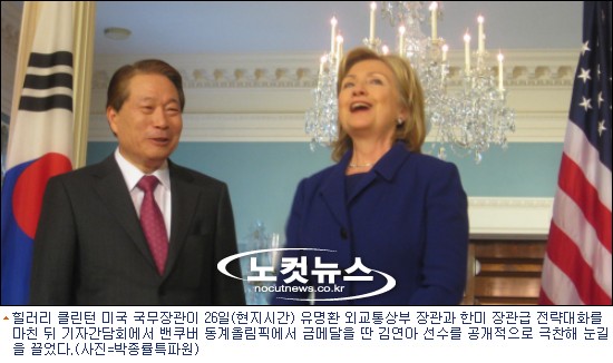 유명환 장관은 이날 기자간담회에서 "피겨스케이팅은 미국민들에게 인기가 높은 경기인 만큼 클린턴 장관도 관심을 가졌던 것 같다"면서 "김 선수의 올림픽 금메달은 한국의 국가브랜드를 높이는 데 큰 역할을 한 것"이라고 평가했다.