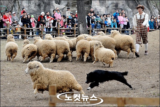 봄기운이 완연한 14일 과천 서울대공원 테마가든에서 양치기견으로 유명한 보더콜리가 조련사와 함께 양떼를 몰고 있다. 양몰이 공연은 매일 오후 1시 반(주말엔 오후 5시 추가)에 관람객들에게 선보인다.