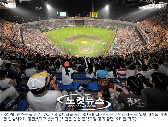 프로야구 SK 와이번스는 올 시즌 문학구장 일반석을 종전 6천원에서 8천원으로 인상하는 등 일부 좌석의 가격을 인상하거나 동결했다고 16일 밝혔다.