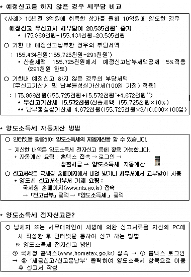 국세청은 ''''올 1월에 부동산 등을 양도한 것으로 확인된 이들 납세자에게 예정신고 안내문을 발송했다''''며 다만 ''''이미 신고하였거나 1세대 1주택 비과세인 경우는 안내 대상에서 제외했다''''고 밝혔다.