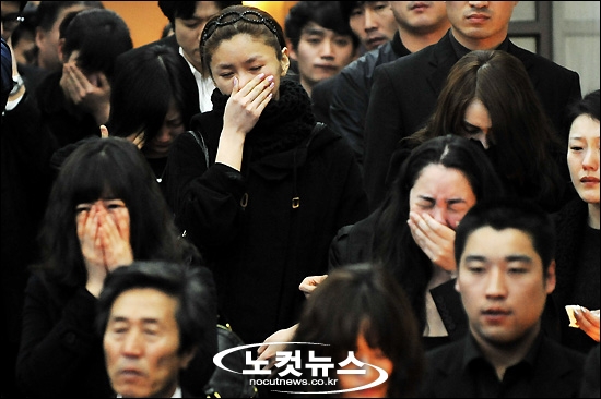 자살로 마흔 살 생을 마감한 탤런트 故 최진영의 발인식이 엄수된 31일 오전 동료 연예인들이 서울 도곡동 강남 세브란스병원 장례식장을 떠나는 운구행렬을 따르며 오열하고 있다.