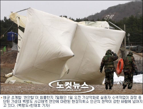 기상청은 "1일 밤 백령도 사고 해역은 구름이 많은 가운데 찬 바람이 초속 10미터에서 14미터로 강하게 불겠고, 기온도 내려가 추워지겠다"고 밝혔다.