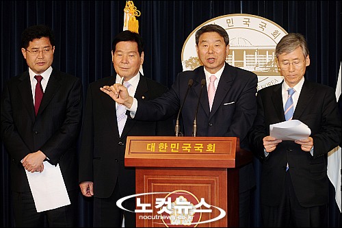 국회농식품위원회 한나라당 법안심사소위원회 위원들이 13일 오전 국회 정론관에서 정부여당이 일방적으로 농협법 개정안을 강행처리하려 한다는 농식품위원회 야당의원들의 주장은 사실이 아니라고 이야기하고 있다. (좌측부터 조진래, 정해걸, 이계진, 여상규 의원)