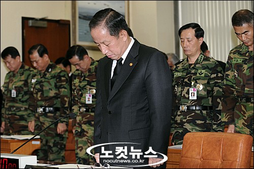 19일 오후 국회 국방위원회 전체회의에서 김태영 국방부 장관과 군 관계자들이 천안함 침몰 사고로 순국한 장병들을 애도하는 묵념을 하고 있다.