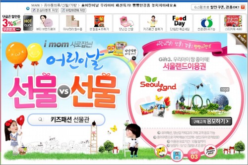 이와 함께 어린이 날을 기념해 다양한 경품 이벤트도 진행한다. ''''선물, 경품 빵빵 이벤트''''에서는 추첨을 통해 ''''아이챌린지와 함께하는 놀이교실 이용권''''(800가족)과 ''''닌텐도 DSi''''(10명), ''''서울랜드 자유이용권2매''''(100명), ''''피자헛 e쿠폰''''(200명) 등을 제공한다. 장난감과 키즈패션 기획전 구매 고객은 누구나 응모 가능하다.