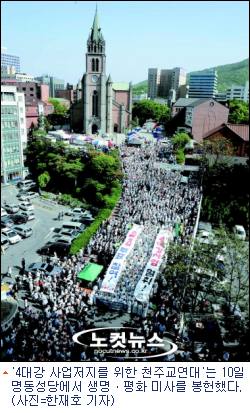 =전통적으로 천주교는 우리 사회의 이슈에 대해 활발한 참여를 해왔다. 민주화 운동과정에서 천주교는 항상 중심에 서왔다. 이런 역사적 배경과 관련이 될 수도, 되지 않을 수도 있겠지만, 천주교가 10일 명동성당 본당에서 ''''4대강 반대미사''''를 집전했다. 이는 ''''4대강사업 반대''''가 한국 천주교의 ''''공식 입장이다''''라고 말할 순 없지만, 천주교 차원에서 지지와 승인을 받은 것으로 볼 수 있다는 것이 천주교 안팎의 분석이다. 실제로 이 ''''4대강 반대미사''''가 열리기까지는 서울 대교구장인 정진석 추기경의 허락이 있었다. 이 때문에 한국 천주교의 전체 움직임으로 보는 것이 크게 틀린 해석은 아닌 것으로 판단된다.
