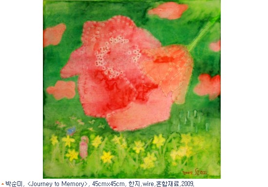 박순미의 <기억속으로 여행, journey to memory>(위 작품은) 양귀비과에 속하는 주황색 뽀삐가 화면을 가득 채우고, 그 아래 노오란 수선화 꽃송이들이 환하게 빛나고 있다. 수선화 사이로 무릎을 포갠 채 앉아 있는 나신의 여인은 바로 눈앞의 나비와 머리 위를 날고 있는 새들을 바라보고 있다. 주황빛 정염과 노오랑 희망을 품은 여인이 나비처럼 새처럼 자유롭게 상상의 나래를 펼치고 있는 듯하다. 작가는 봄날에 느낀 단상을 이처럼 맑고 따뜻한 형상과 색채,그리고 wire(철사)를 이용한 바느질로 구성하여 표현하고 있다.