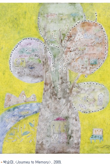 박순미 작가의 <기억속으로 여행> 연작을 통해 물고기들이 노니는 호수에서 벌거벗은 남녀가 꽃배를 타고 뱃놀이을 하는 장면,그리고 새와 물고기, 그림같은 집, 자그마한 동산이 어우러진 ''은행나무 풍경''을 보노라면, 관객들은 작가가 인도하는 별천지를구경하게 될 것이다.