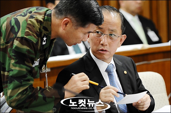 김태영 국방부장관이 24일 오후 서울 여의도 국회의사당에서 열린 국회 천안함 사건 진상조사특별위원회 첫 회의에 출석해 군 관계자의 보고를 받고 있다.