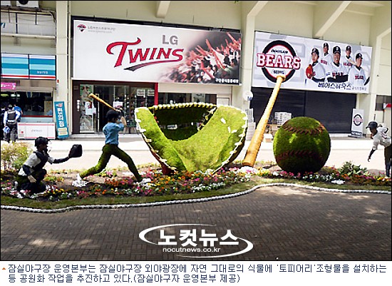 잠실야구장 운영본부(LG스포츠 사장 안성덕)는 2일 서울시 체육시설관리사업소의 지원을 받아 잠실야구장 전광판 뒷편 외야광장에 자연 그대로의 식물에 ''토피어리''조형물을 설치하는 등 1차 공원화 작업을 마무리했다고 밝혔다.