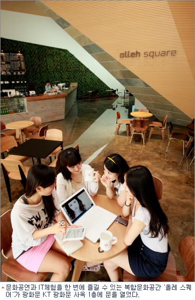 KT는 광화문 사옥 1층에 IT체험과 문화공연 관람을 함께 즐길 수 있는 복합문화공간 ''''올레스퀘어''''를 지난 5월 24일 오픈했다.