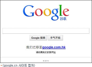 이제 google.cn 사이트는 자동으로 홍콩 사이트로 우회접속 되는 것이 아니라, 상단에 ''''google.com.hk로 옮겼습니다''''라는 안내문구가 뜨며, 로고나 텍스트를 클릭하면 홍콩 웹사이트로 접속돼 검색을 계속할 수 있도록 변경됐다. [BestNocut_R]
