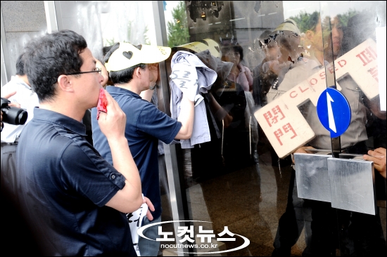 [BestNocut_R]전국언론노동조합 KBS본부(본부장 엄경철)가 0시를 기해 전면 총파업에 돌입한 1일 오후 서울 여의도 KBS 본관 앞 계단에서 전국 조합원 총회가 예정된 가운데 사측이 노조원들의 건물 내 진입을 막고 있다.