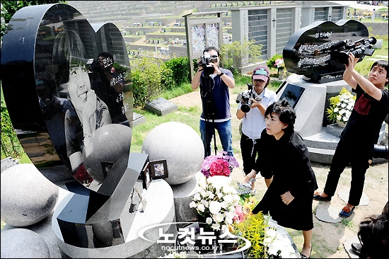 탤런트 故 최진영의 사망 100일째인 6일 오후 경기도 양평 갑산공원에 마련된 고인의 정식묘가 故 최진실의 묘역과 나란히 자리한 가운데 어머니 정옥숙 씨가 남매의 묘비를 차례로 닦아주고 있다.