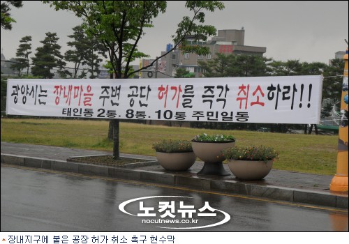 그러나 철강공장 허가 사실을 뒤늦게 안 태인동 장내마을 통장 등 주민 20여 명은 녹지지대인 땅에 공장이 들어서면 공해 피해가 극심하다며 광양시에 집단민원을 냈다.