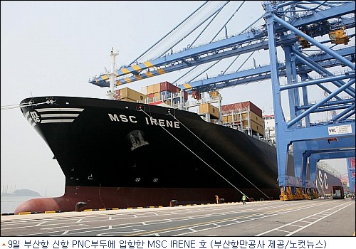 9일 새벽 부산항 신항 북(北)컨테이너터미널의 PNC부두에 세계적 해운회사인 MSC사의 이레네(IRENE) 호가 입항했다.