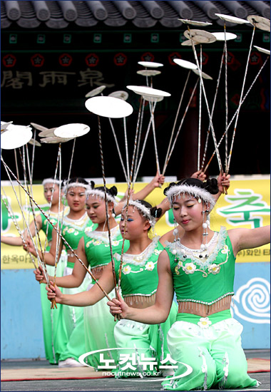 18일 오전, ''한가위 대축제''가 열리고 있는 남산골 한옥마을에서 동춘서커스단 단원들이 화려한 쟁반돌리기 묘기를 펼쳐 보이고 있다.