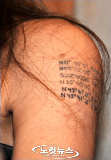영화 ''솔트'' 홍보차 내한한 할리우드 배우 안젤리나 졸리가 28일 저녁 서울 영등포CGV에서 열린 레드카펫 행사에 참석한 가운데 양쪽으로 늘어선 팬들을 향해 인사를 건내는 동안 안젤리나 졸리가 여섯 자녀의 출생지를 경도와 위도로 표시한 왼쪽 어깨 문신이 선명하게 보이고 있다.
