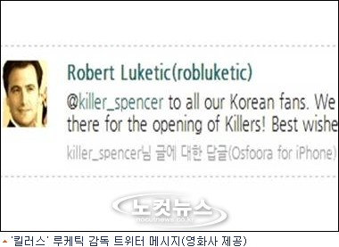 할리우드 꽃미남 애쉬튼 커쳐가 강한 남자로 분해 기대를 모으고 있는 액션 코미디 ''''킬러스''''가 8월 19일 개봉을 앞둔 가운데 ''''킬러스''''의 로버트 루케틱 감독이 국내 영화 트위터에 글을 남겨 화제다.
