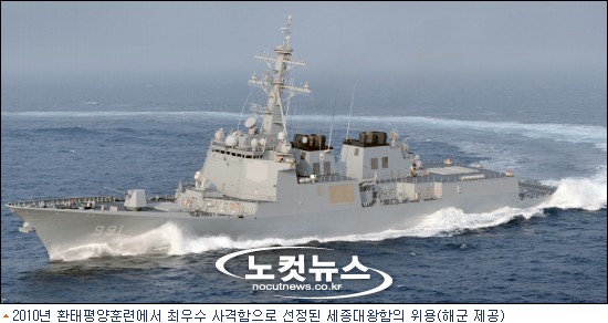 한편 지난 2008년 12월 취역한 세종대왕함은 우리 해군 최초의 7,600톤급 이지스 구축함으로서 SPY-1D(V) 레이더 등으로 구성된 이지스(Aegis) 전투체계를 탑재해 동시에 1,000여개의 표적 탐지 및 추적이 가능하고 그 중 20개의 표적을 동시에 공격할 수 있다.
