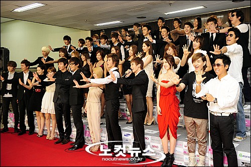 SM 타운의 가수, 연기자들이 모두 출연하는 SMTOWN LIVE ''''10 WORLD TOUR in SEOUL 콘서트가 21일 오후 서울 잠실 올림픽주경기장서 열린 가운데 출연자들이 성공적인 공연을 기원하며 오프닝 세레머니를 펼치고 있다.