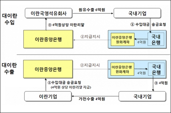정부는 국내은행에 이란중앙은행의 원화계좌를 개설해 對이란 수출입 대금을 원화로 결제할 경우 불법적인 자금거래를 확실히 차단하고 합법적인 거래의 안정성을 보장할 수 있을 것으로 보고 있다.