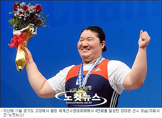 장미란은 세계 여자 역도에서 이미 전설이 된 선수다. 그는 2005년 카타르 도하 대회, 2006년 도미니카공화국 산토도밍고 대회, 2007년 태국 치앙마이 대회, 2009년 경기 고양 대회에서 용상과 합계 금메달을 목에 걸어 세계선수권대회 4연패를 이뤘다.