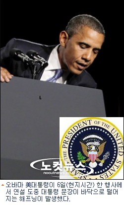 버락 오바마 미국 대통령이 6일(현지시간) 한 공식행사에 연설하던 도중 연설대에 부착됐던 대통령 문장이 바닥으로 떨어지는 해프닝이 발생했다.