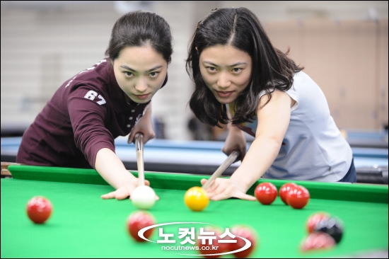 [BestNocut_R]광저우 아시안게임을 한 달여 앞둔 12일 오후 서울 공릉동 태릉선수촌에서 당구대표팀의 차유람(왼쪽), 차보람 선수가 구슬땀을 흘리며 훈련에 매진하다 취재진을 향해 포즈를 취하고 있다.