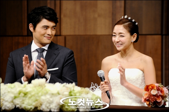 [BestNocut_R]탤런트 진재영과 4살 연하의 프로골퍼 진정식 씨가 17일 오전 서울 장충동 신라호텔 영빈관 에메랄드홀에서 결혼 기자회견을 갖고 있다.