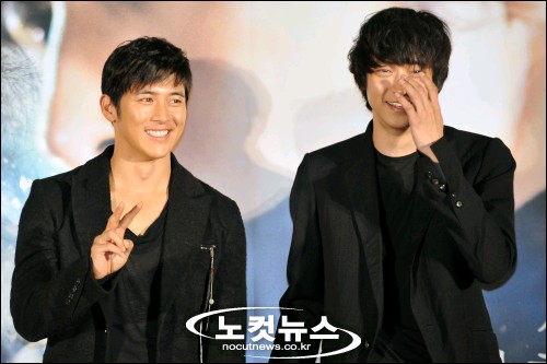 영화 ''초능력자'' 제작보고회가 18일 오후 서울 동대문 메가박스에서 열린 가운데 배우 강동원(오른쪽), 고수가 포토타임 중 포즈를 취하고 있다.