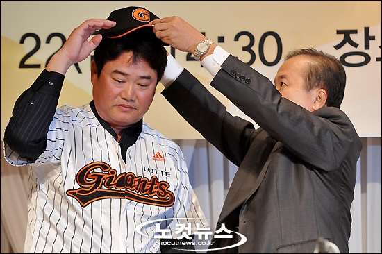 프로야구 롯데 자이언츠를 이끌 양승호 신임 감독과 함께 선임된 윤학길 신임 코치가 22일 오후 서울 잠실 롯데호텔에서 가진 취임식에서 장병수 롯데자이언츠 사장으로부터 유니폼과 모자를 전달받고 있다.