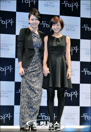 영화 ''두여자'' 제작보고회가 25일 오전 서울 압구정CGV에서 열린 가운데 주연배우 신은경, 심이영이 포즈를 취하고 있다.