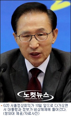 이 대통령의 일정도 모두 G20에 포커스가 맞춰졌다. 매일 이뤄지는 G20 준비위원회로부터의 일일보고 외에 3일은 내외신 기자회견이 잡혀 있고 5일에는 미국 월스트리트 저널지와 인터뷰가 예정돼 있는 등 대통령으로서 어쩔 수 없이 주재해야 하는 국무회의나 수석비서관회의, 국민경제대책회의 등을 제외한 모든 일정은 G20 이후로 미뤄지는 등 집권 후 가장 바쁜 시기를 맞이하고 있다.