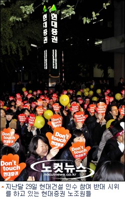 계열사인 현대증권 노조원 500여 명은 지난달 29일 현대증권 본사 사옥 앞에서 시위를 갖고 현대건설 인수 참여를 전면 철회하라고 요구했다.