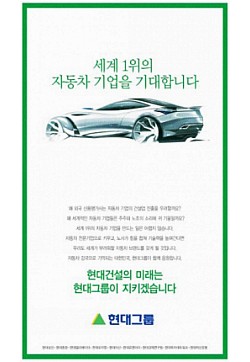 현대차는 지난달 4일자 24개 일간지에 ''자동차 강국으로 기억되는 대한민국, 현대그룹이 함께 응원합니다''라는 광고를 실었다. 자동차사업에나 전념하라는 말이었다.