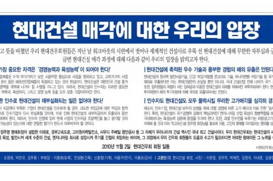 현대건설 퇴직 임직원 모임인 현대건우회는 2일 주요 일간지 광고를 통해 "자금력이 부족한 기업의 인수로 현대건설이 다시 부실화되는 일은 없어야 하며 투자 여력과 육성의지, 경영능력을 두루 갖춘 기업이 인수해야 한다"는 의견을 밝혔다.