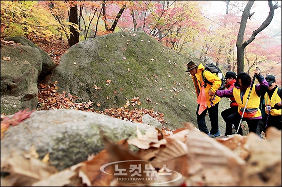 ''봉사와 나눔문화'' 활성화를 위해 마련된 이날 등반에서 200명의 시각장애인들은 엄홍길 대장을 비롯한 자원봉사자들과 등산용 로프로 하나가 돼 화려한 가을산의 정취를 만끽했다.
