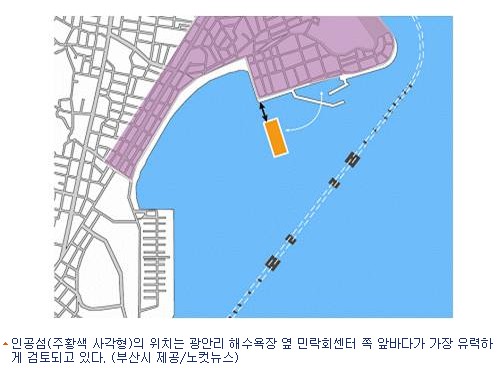 인공섬의 입지는 현재 광안리해수욕장 민락회센터 쪽 앞바다가 유력하게 검토되고 있다.