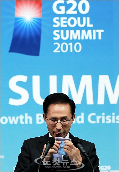 서울 G20 정상회의의 공식 일정이 마무리되는 12일 이명박 대통령이 서울 삼성동 코엑스 오디토리움에서 가진 내외신 기자회견에서 정상들의 합의를 담은 서울선언문을 발표한 뒤 손수건으로 입을 닦고 있다.