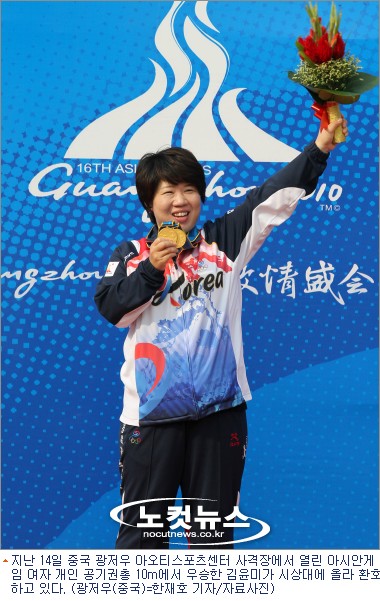 우리 사격대표 김윤미 선수가 지난 14일 광저우 아시안게임 여자 10m 공기권총 개인전과 단체전에서 두개의 금메달을 목에 걸었다.