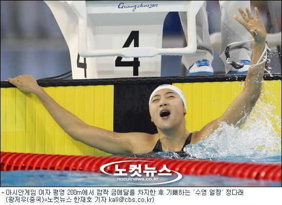 삼 세번만에 따낸 금메달이다. 이번 아시안게임이 첫 출전인 정다래는 대회 첫날인 13일 평영 50m에서 결선에 진출했지만 4위에 그쳤고, 전날 평영 100m에서도 3위에 그쳐 두번 모두 아쉽게 메달 획득에 실패한 바 있다.[BestNocut_R]