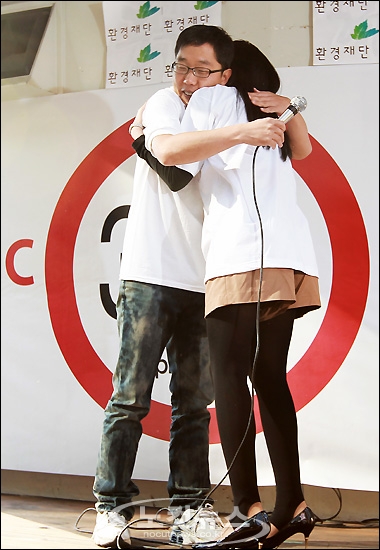 방송인 김제동이 18일 서울 명동 거리에서 열린 환경재단 ''350 캠페인''에서 반팔 차림으로 시민들과 사진을 찍다 한 여성과 포옹을 하고 있다.